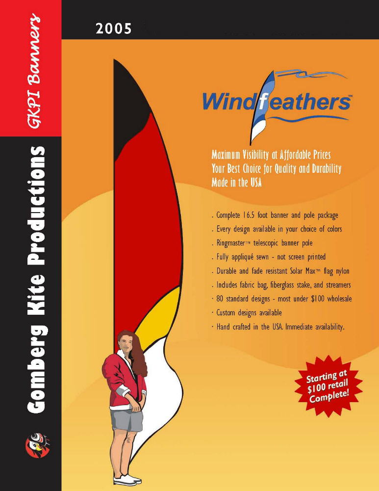 Text Banners send a bold message at a reasonable price. "Stock" designs are just $170, and if you have something else in mind, we can make you a custom Windfeather for just $230. That price includes up to ten letters and can be in any color as long as you use the standard format. Click on any image for a larger view. |