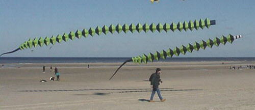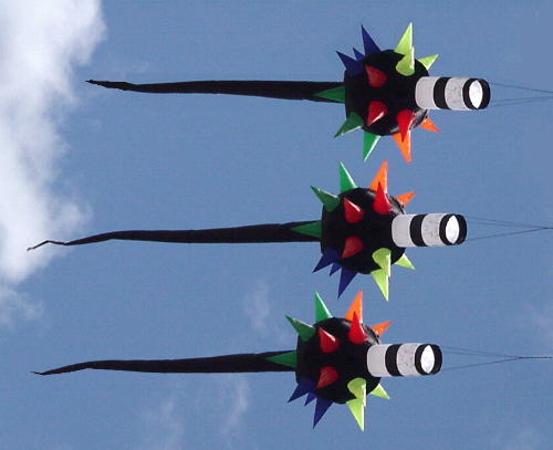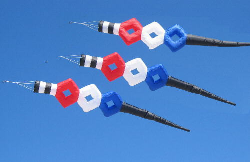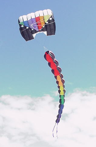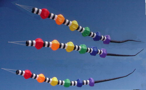 Lightning Bolt: Electrify your kiteline with this colorful piece of line art. Choose rainbow, or design something more personal. We'll make them any way you like! The remarkable zigzag shape holds firm in the wind Bolts are ten feet long with six colorful sections. You can get one for $36 or three for $90.