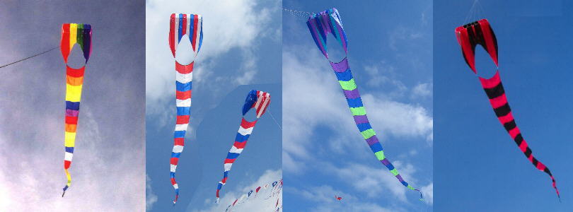 Transition Tails: These colorful flat tails have long been a favorite kiting accessory. You can hang them on your line or attach them to the kite. For more fun, hook them on a long pole and whirl them around. We stock red, yellow, blue or purple, each with a black accent and white divider. We also carry "Rainbow", (red, orange, yellow, green, blue, purple), "Patriot" (red, white, blue), "Phoenix" (red, yellow, black), and "Miami" (light blue, purple, black. Make a personal transition! And with GKPI, you can always request custom color combinations.