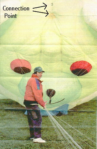 Attach your pilot line to the center of the yoke. We chose the two center bridles because the lift of the pilot needs to be centered on the larger kite below. Usually I will connect the yoke at the top of bridles -- close to where they meet the fabric. Remember that the pilot may fly behind or downwind of the larger primary kite. To keep the yoke line from rubbing against the fabric of the primary kite, I usually attach it a foot or so down the bridle line. |
