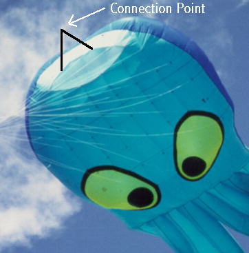 Other kites, like many Octopus or Geckos already in circulation, do not have factory installed connection points but can easily be retrofitted. Simply attach a length of line (6 feet on middies and 12 feet on maxis) to the two center bridle lines. We'll call this new line the "yoke". Tie a knot at each end of the yoke. Then you can connect the ends of the yoke to the bridles of the main kite by simply folding a loop into those bridle lines and larksheading around the knots in the yoke. You don't even need to make a permanent knot in the bridles! |