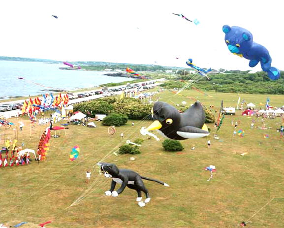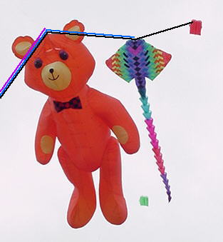 Here is another view of big kites being stached from a single anchor. The Pilot Kite (above the bear) is outside the frame. |