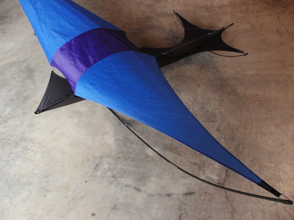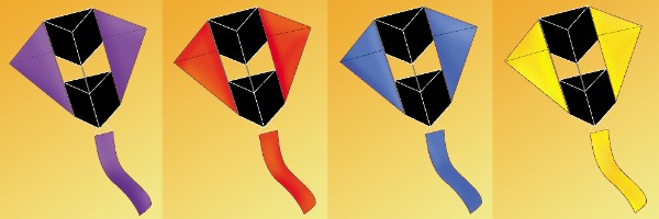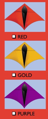 Choose red, blue, or purple as the predominant color. Each kite is constructed from fiberglass framing and a ripstop sail. $150 each. Use 100 to 250 pound line in 5-15 mph of wind.