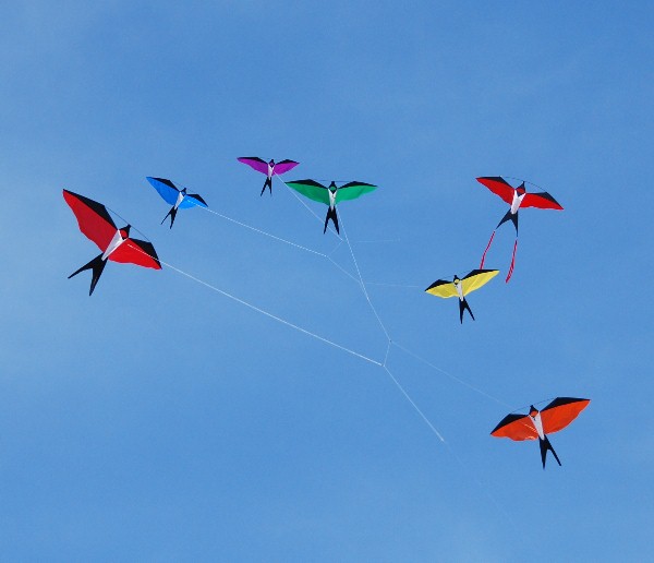 All of our Pyros and Ghosts can be configured to fly in trains. To do that, you need to make an adjustment to the sail so the line can bass through from kite-to-kite. Click here for a photo. |