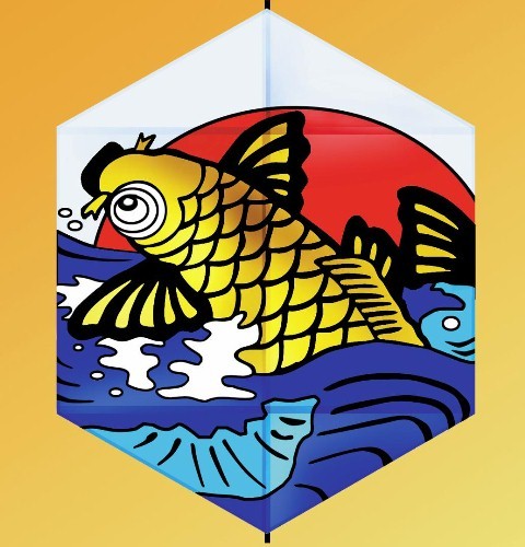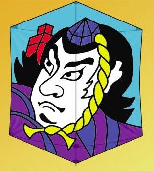 Kabuki Rokkakus: Take a new look at the classic fighting kite of Japan. The hexagonal Rokkaku Kite was originally developed for traditional kite fighting in Japan. Large paper and bamboo kites flown by teams would tangle, tip, or crash together and the last kite in the sky was the winner. Our four-foot Kabuki Rokkakus are based on a series of traditional kite images from Japanese history, literature, and folklore. These are illustrations typically used on traditional rokkakus. The stability and convenience of this modern Rokkaku make it great for fun flying, lifting, or fighting. Adjustable bow lines allow tuning for different winds. "Roks" fly well in all winds and are excellent for intermediate or advanced fliers. They will also hold tube tails or line art. Use 100-200 pound flying line. In Japanese, a "kaku" is a kite with corners. "Rok" is the word for the number six. The Kabuki Roks are four by three feet and made from ripstop nylon with fiberglass frames. The images are compltely applique sewn, not printed. Choose the Watonia Warrior, the Koi, Tukinami Wave, Folk Hero Suke Roku, Brigand Benki, or Loyal Retainer Otaka -- each priced at $90.