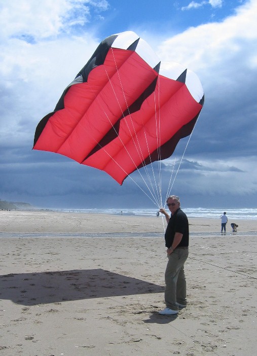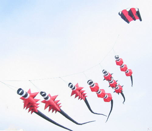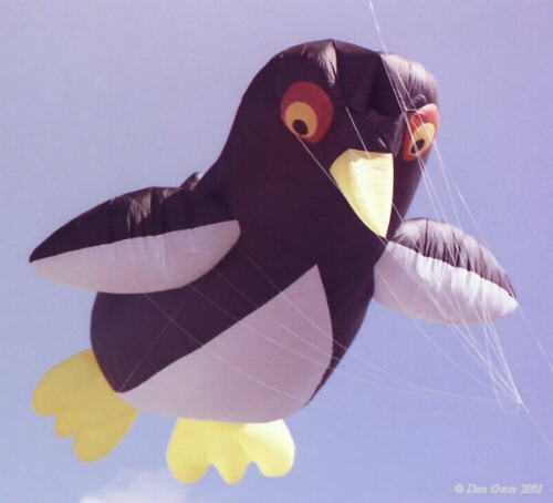 Think of hot air balloons. Think of the Thanksgiving Day Parades. Did you ever imagine that you too could be flying something like that?? Inflatable kites have no sticks. They are filled by the wind and a specially engineered internal structure gives them shape. And we can make them really big! Usually we add a "lifter kite" to increase buoyancy and stability. |