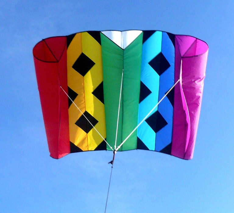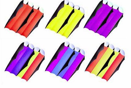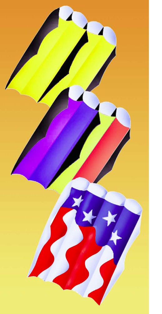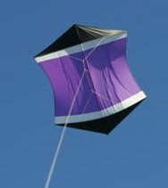 Our kite measures 5.5 feet tall and 4.5 feet wide. Click here for a photo. It is constructed of durable ripstop with a fiberglass frame and comes complete with our exclusive Tuning and Fighting Guide.. We use the four-bridle-point configuration for ease of tuning. Choose red, orange, yellow, green, blue, or purple. "Roks" fly well in all winds and are excellent for intermediate or advanced fliers. They will also hold tube tails or line art. Use 100-200 pound flying line. Just $65 each. |