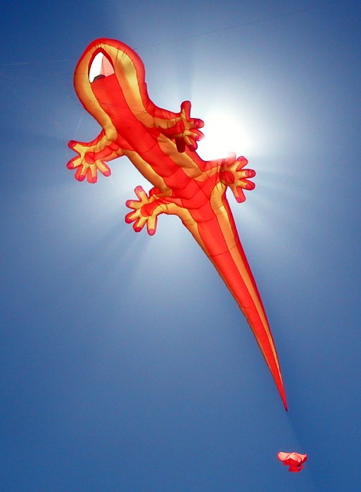 Inflatable Gecko: Watching this 25 foot Peter Lynn lizard "climb" into the wind will amaze everyone. The tail and legs create a realistic motion in any breeze. Yes, it will fly alone, but we strongly recommend a lifter for added stability and flight angle. . We can make Gecko in red, orange, yellow, green, light blue, dark blue, violet, purple, or black. You pay just $460 for this enormous show stopper! And you get to choose the colors too!! Click here for a photo. |