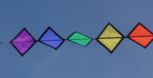 24 Inch Fun Fly Diamond Kites Our two foot solid colored Fun Fly Diamond Kites are super fliers and super fun too! Each kite has a ripstop nylon sail, fiberglass frame, and comes complete with line, handle, and tail. Choose red, orange, yellow, green, blue, purple, or white for $12.00 each. The fabric is easy to decorate with a permanent marking pen. Click here to see our kites used in a school project.. |
