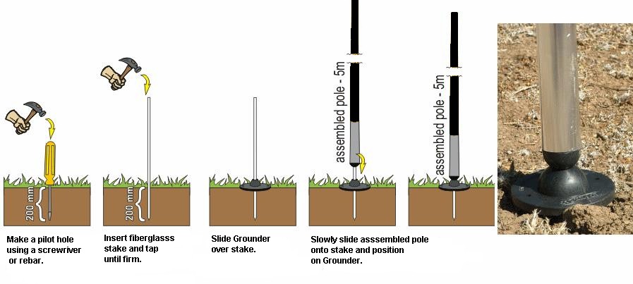 Banner Stakes: Many people use rebar to anchor their banners. And that's why their poles break. The metal edges rub the inside of the pole and weakens it. And the metal doesn't flex in the wind. The preferred way to anchor your poles is with lighter weight, flexible and clean fiberglass stakes. Simply position the stake where you want to display your banner or pole. Tap the rod into the ground or sand until solid. This could be as little as 10 inches or as much as two feet. Slide the hollow pole base over the stake and down to the ground. Add an optional plastic ground base for more support. The GKPI stake is a 42 inch solid 1/2 inch diameter fiberglass pole. Buy them in a set with your poles or buy them separately for $9 each. |
