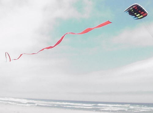 | Gary MacEachern of Brookings, Oregon, wanted a perfect kite for his multiple kite routines and long, long tails. He chose the best materials and designed a big-wing for a wide wind-range and smooth flight. Then he asked GKPI to make it for him. |