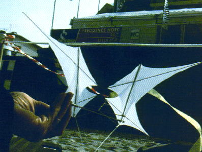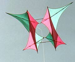 All kites are available in your choice of one solid color, and are framed in birch dowel or 3mm carbon for indoor flying. The indoor version won 1st place at the International Indoor Festival of Amsterdam in 1995. |