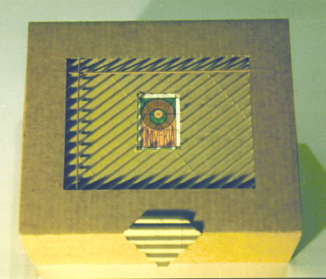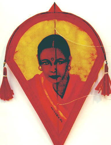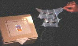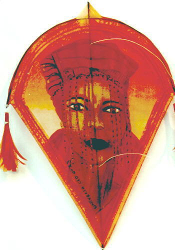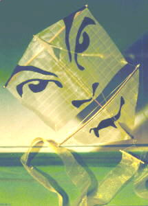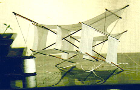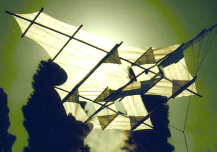 The "Dondai": This is a dramatic but simple design. The elongated wings give the kite an "codyesque" appearance, but with a much more modern flair. The Dondai was conceived and developed by Claudette and Guy's son Tom in 1994. The overall size is 21 x 32 x 10 centimeters -- about 8 by 12 inches. Each kite is constructed from one or two colors of spinnaker and includes a matching tail. The carbon model is preferred to the dowel sparring for ultimate performance. Like all Goselin kites, the Dondai is a fine flier and can be adjusted for varying wind conditions. Your cost is $45 plus $15 shipping. |