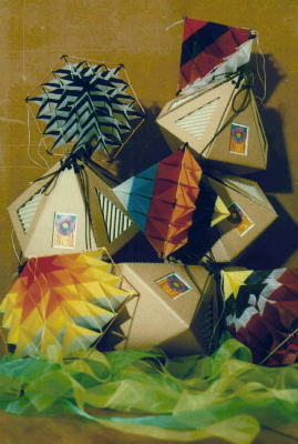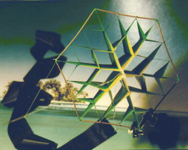 The Snowflake: The multi-facet Snowflake was invented by Englishman Stephen Robinson. This model has a hexagonal exterior frame supporting 36 vents. The finished size is 18 x 20 x 20 centimeters. That's roughly 7 by 8 by 8 inches. Each piece contains two spinnaker colors -- examples include black and red, black and white, red and white... Like all Goselin kites, the Snowflake is a fine flier and can be adjusted for varying wind conditions. Your cost is $84 plus $15 shipping. |