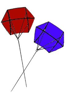 What is a Rokkaku?The Rokkaku (pronounced roke-cock-coo) is a traditional Japanese bowed kite design. A basic hexagon in shape, it features six corners, a long center spine, and two cross spars. The bridle connects at four or more points. Combat FundementalsWestern style Rokkaku "battles" are usually organized for either individuals or teams. The size of the kites is specified within certain ranges, only certain types of flying line are allowed, and flying is limited to a designated area for safety. On a given signal, all kites are launched. Then a second signal is given and the kites "engage". The object is to ground other kites using either your line, your kite, or the wind. Once your kite is cut or touches the ground for any reason, you are out. There are three basic techniques for grounding an opponent's kite. The most effective strategy may combine all three tactics. |