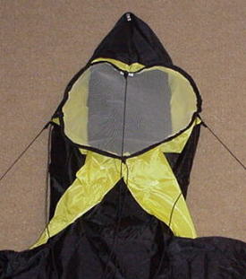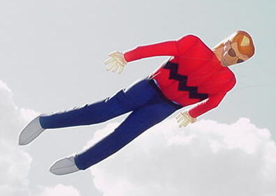 Top Half: He waves; he wanders; but mostly he just sits there and stares down at you with that unyielding smile. Easy to launch and to fly. But most important, the Lester Top Half is one of the most whimsical attention-getting kites on the field. Put a whole team out there and see what kind of fun develops. The standard Top is three feet wide and eight long. We offer them for $180 plus shipping. Ask for a special deal on three or more. Or if you are feeling extravagant, go for the bigger 30 foot Big Top at $2000. |