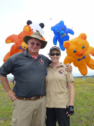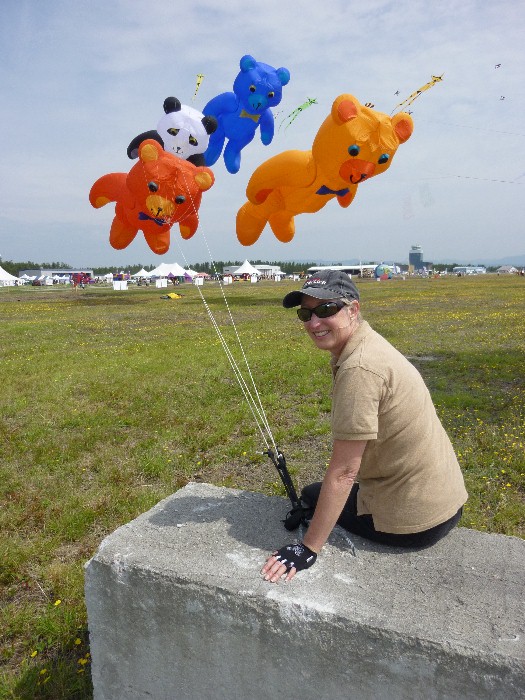 The festival logo is a giant bear and we've brought three big ones to fly. The fields are huge. But large cement block kite anchors have been placed every 100 feet in each direction. We appreciate the effort, but know this means we can't fly the gusty, up-and-down wind without snagging one.