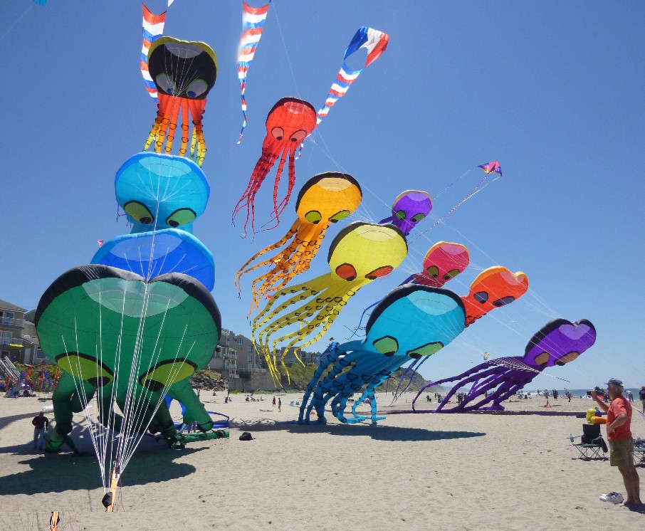 I've traveled over 75,000 miles so far this year. Visited 7 countries. And where do I find the best flying? At the festival right down the street. This was the 26th Lincoln City Summer Kite Festival and conditions were perfect. Winds came straight off the water; tide was out so beaches were wide; the river itself flowed direct to the ocean rather than across the field; and the sun beamed all weekend. It was a 9 out of 10 on the festival scale. |