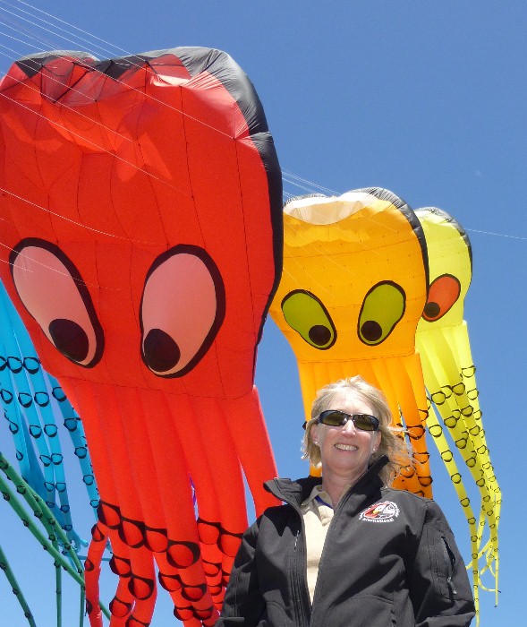 There was a time when the West Coast Championships drew 100 competitors. But at some point, the focus shifted to Big Kites. It may have been when Bob Anderson flew his giant Sock on the Hill. Or perhaps it was Brian Champie and Dan Whitney lifting larger inflatables. But my personal take is that it happened the day Lolly Hadzicki missed her plane and the Revolution learn-to-fly field was left open. Susie and I took advantage of the vacancy to fly an Octopus in the middle of the festival. And suddenly, instead of off on one side, the large kites were in the main arena. |