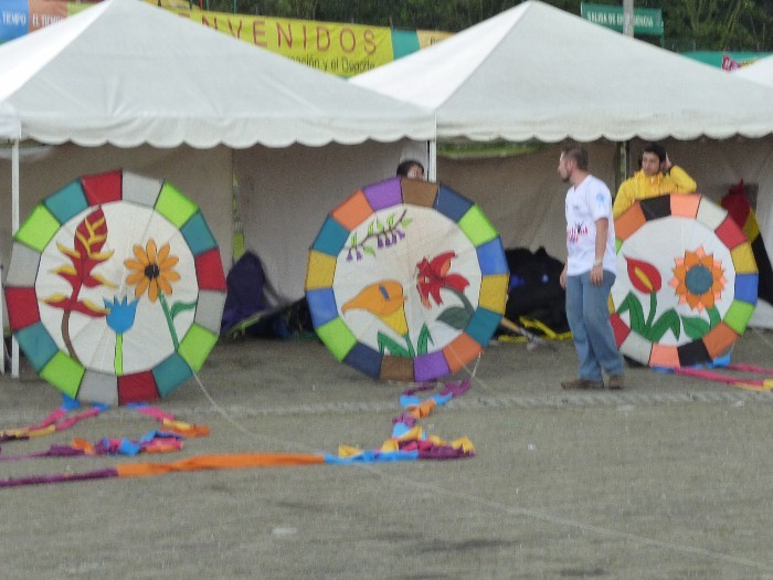 Friday moring, after a few scant hours of sleep, we were divided into three teams and sent to different schools. My group met with about 300 children in two waves. We did a short exhibitions and then helped assemble plastic sleds with sticks, bridles, and tails. Then we just stepped back out of the way as pandemonium ensued. Three hundred kites. Three hundred kids. Three hundred different directions to run. And no way to communicate in Spanish!! My last group were intellectually disabled students. They enjoyed the kites much like the kids we support in South Africa. And often they made their kites better then the "normal" children. Saturday we departed early for our first flying show. Our gear was secured in the shadow of several enormous speakers. An adjacent paved area was marked off for sport kite shows. We went to look for ear plugs and anchors.