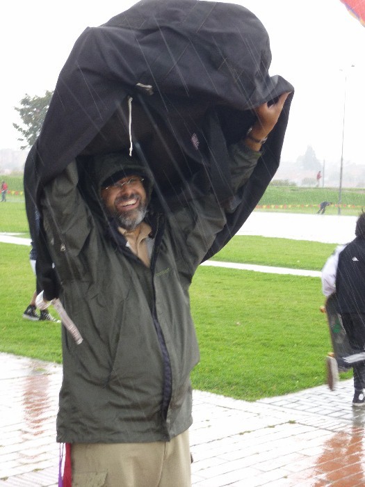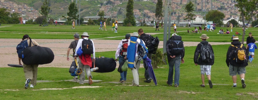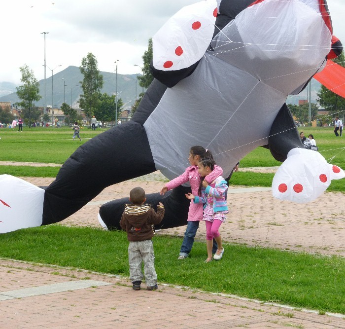 Weekend in Bogota It sounds a bit crazy, doesn't it? Flying to South America for a weekend. But that is the glamorous, jet-setting life I lead! Up and on the way to the airport at 2 am Thursday morning. Working with kids in Bogota on Friday. Flying in a park Saturday. Performing in a stadium on Sunday. And then departing for home at midnight Sunday night. I'm sure many of you are jealous -- except for the jet-lag thing. The events in Colombia are organized by Inez and Jairo Uribe of Yripa. Their organization promotes ecology and ethics in the schools using kites as a teaching tool. |