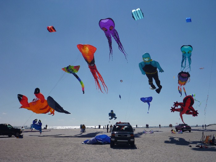 Large GKPI inflatables were not the only kites on the beach. There was a bevy of vented Revs dancing in the gusty winds, lots of banners and ground bouncers, and some huge custom kit kites over on the edge. Click here for a brief video compiled by Laura Podlasek. What's Jeff pointing at?? He may have just noticed where Jim Martin's octopus disappeared to.... We're back in Oregon now and planning to stay here a few weeks. Traveling is a great and rewarding adventure. But the best flight is the one that brings you home. |