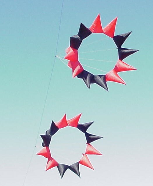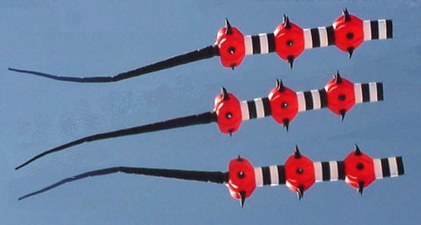 I've got a big bag here stuffed with red/black/white line laundry. Great stuff, of course. But I just haven't been able to fly any lately. Instead, we've been filling the skies with animals and other new inflatables. I hate to see a good kite grow musty. So if you'd like to air any of these out, I'll take off 50% of the purchase price. Good deal - good colors - great show! And if you aren't 100% happy, just sned them back. Here's what we have. |